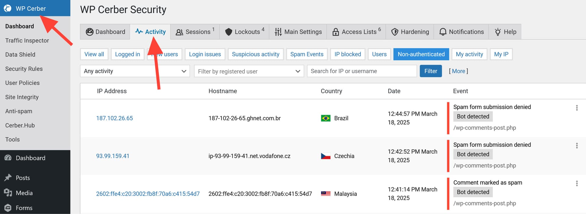 My email signature is not allowing access to my listings button. I can not find the WP Cerber activity log.
