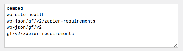 Hi Garry, Zapier is on a Cloud Service so we can’t do IP specific blocks. This needs to be a Request URL Whitelist. I would prefer being able to address this with the full directory or /wp-json/gf/v2/* to cover the entire directory range.
