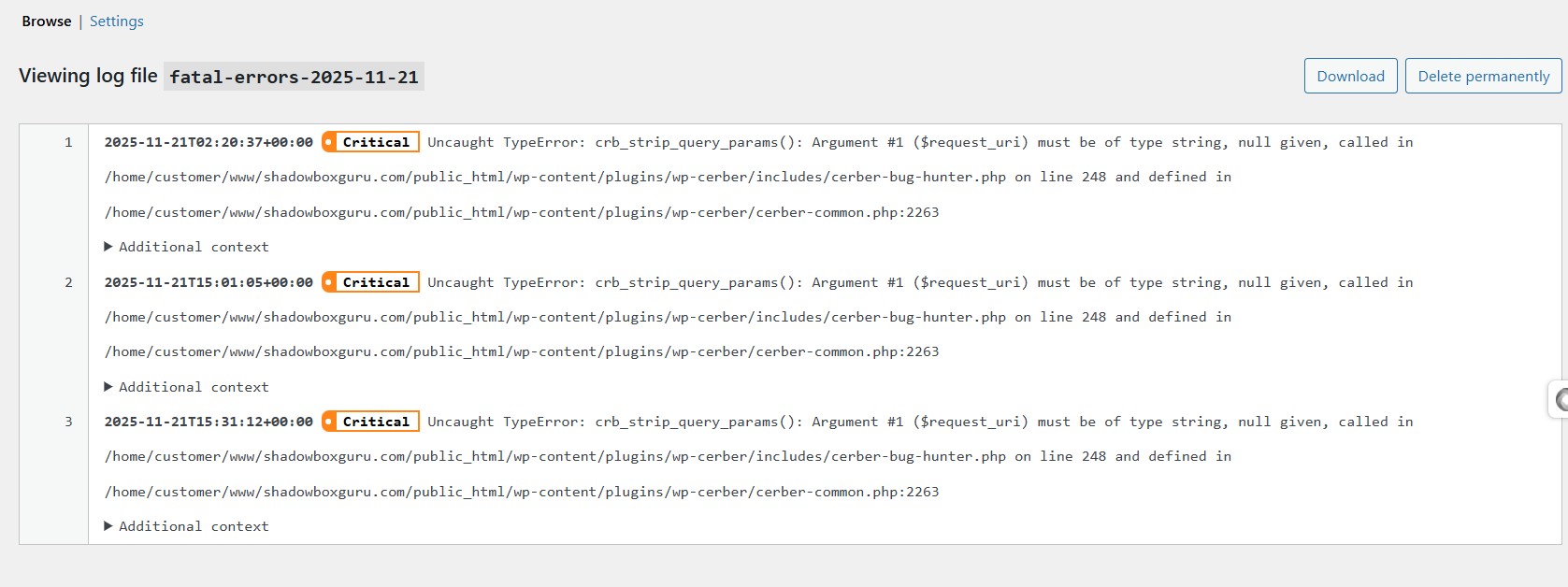 - collecting error information generated by WP Cerber,