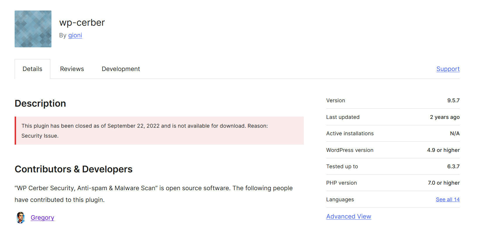 • On the plugin’s official page on wordpress.org, the plugin has been closed since 2022 with a big “Security issue” banner, and this message has been displayed for more than three years now without any update or clear explanation.